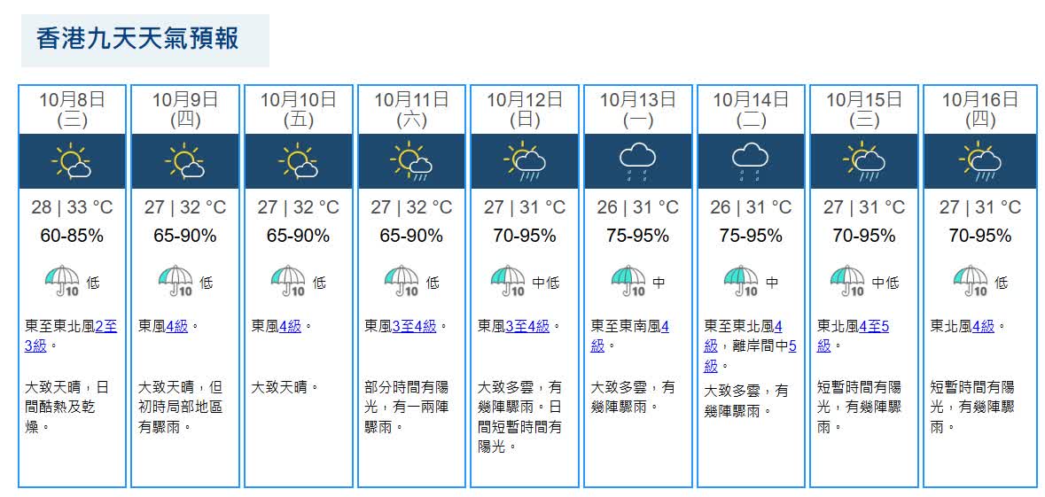 展望本港未來一兩日大致天晴,明日(9日)周四大致天晴,但初時局部地區有驟雨,氣溫介乎27至32度。至周五(10日)大致天晴,氣溫介乎27至32度。周末期間部分時間有陽光,有一兩陣驟雨。