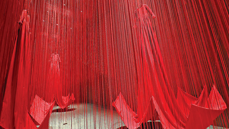 重製版日本籍藝術家山崎鶴子的蚊帳狀立體作品——《赤》有着明艷的紅色,原作打造於1956年;結構呼應了日本臥室床鋪上方的立方形蚊帳。觀眾可從作品底部鑽入,站在外部的觀眾則能看到作品內若隱若現的人影。