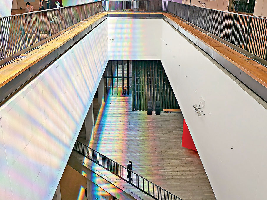 踏入M+,便能看到韓國籍藝術家金守子以彩虹為主題打造的委約作品《呼吸》,這是特展的一部分。藝術家以半透明繞射膠片包裹了窗戶。變換的日光下,這份人工彩虹將照射到博物館的不同區域。
