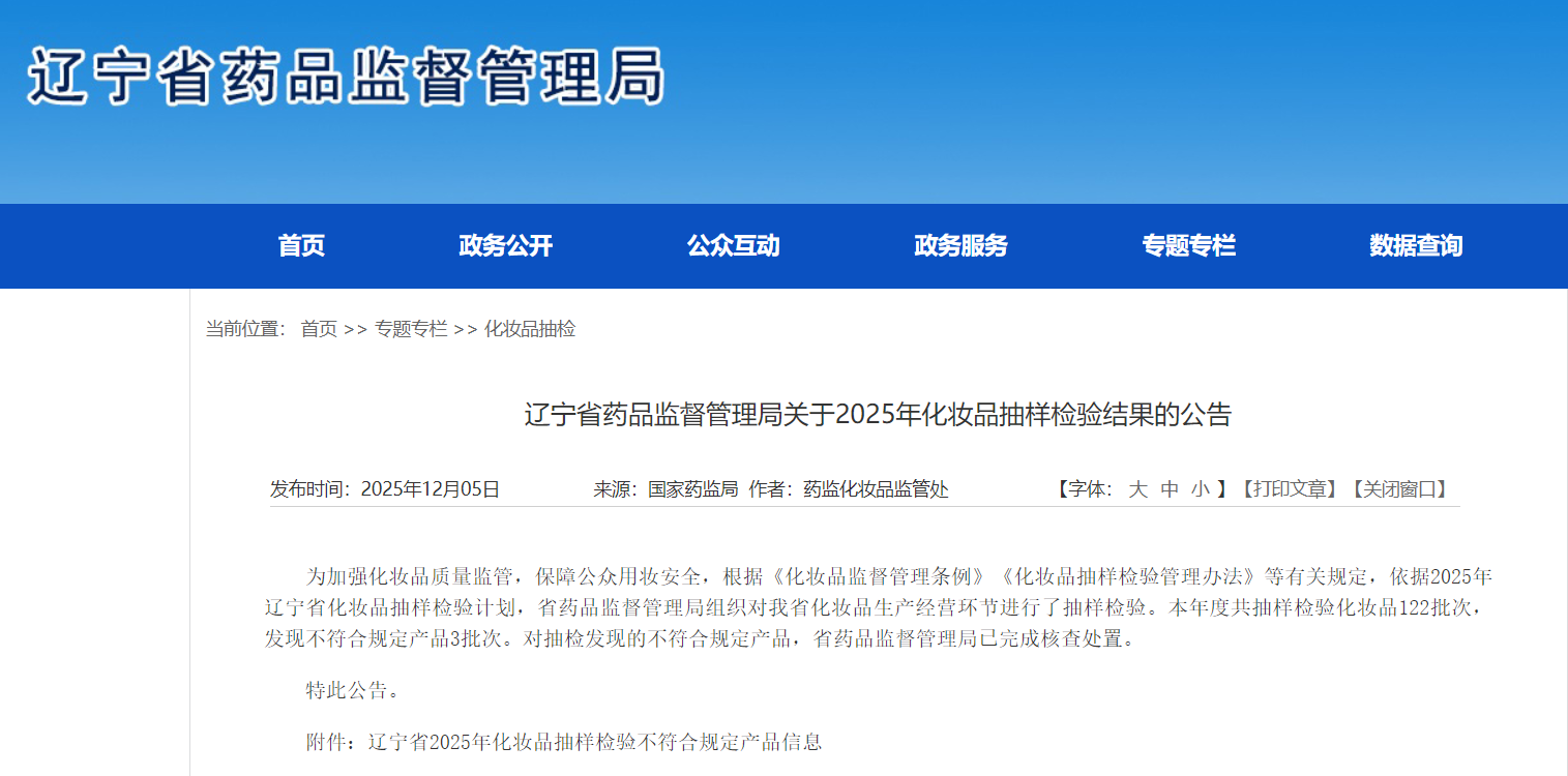 为加强化妆品质量监管,保障公众用妆安全,根据《化妆品监督管理条例》《化妆品抽样检验管理办法》等有关规定,依据2025年辽宁省化妆品抽样检验计划,省药品监督管理局组织对我省化妆品生产经营环节进行了抽样检验。本年度共抽样检验化妆品122批次,发现不符合规定产品3批次。对抽检发现的不符合规定产品,省药品监督管理局已完成核查处置。