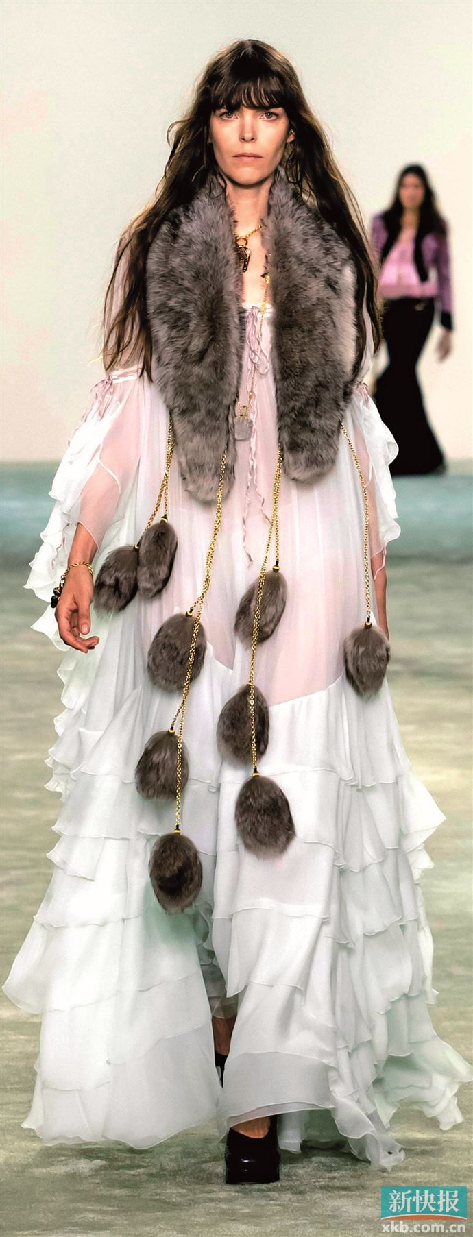 今季皮草以边饰形式巧妙点缀袖口、领缘、裙摆或包袋等的时尚趋势是一大亮点,甚至发箍、发夹、手镯等配饰也能看到它的身影,真可谓“无处不在”。