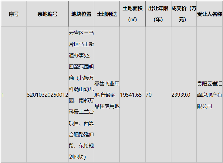 云岩区两宗住宅用地分别被贵阳云岩筑黔房地产有限公司和贵阳六岩天秀房地产有限公司竞得,成交价分别为3.69亿元和2.40亿元,显示出核心区域住宅用地持续受到市场青睐。