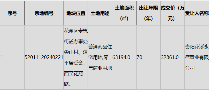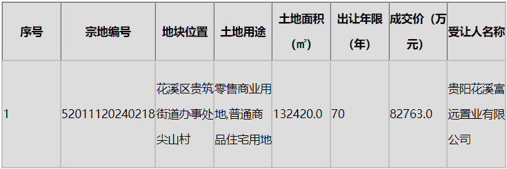 在住宅用地方面,花溪区贵筑街道办事处尖山村地块(编号52011120240218)以8.28亿元的成交价成为本次出让的"标王",该地块面积达132420平方米,由贵阳花溪富远置业有限公司竞得。