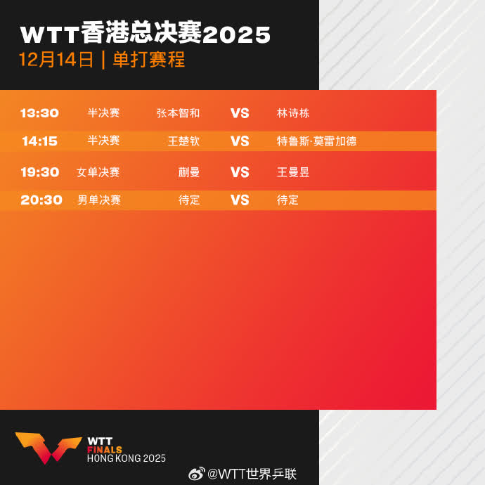 WTT香港總決賽|今日賽程:王曼昱與蒯曼爭奪女單冠軍 林詩棟對陣張本智和