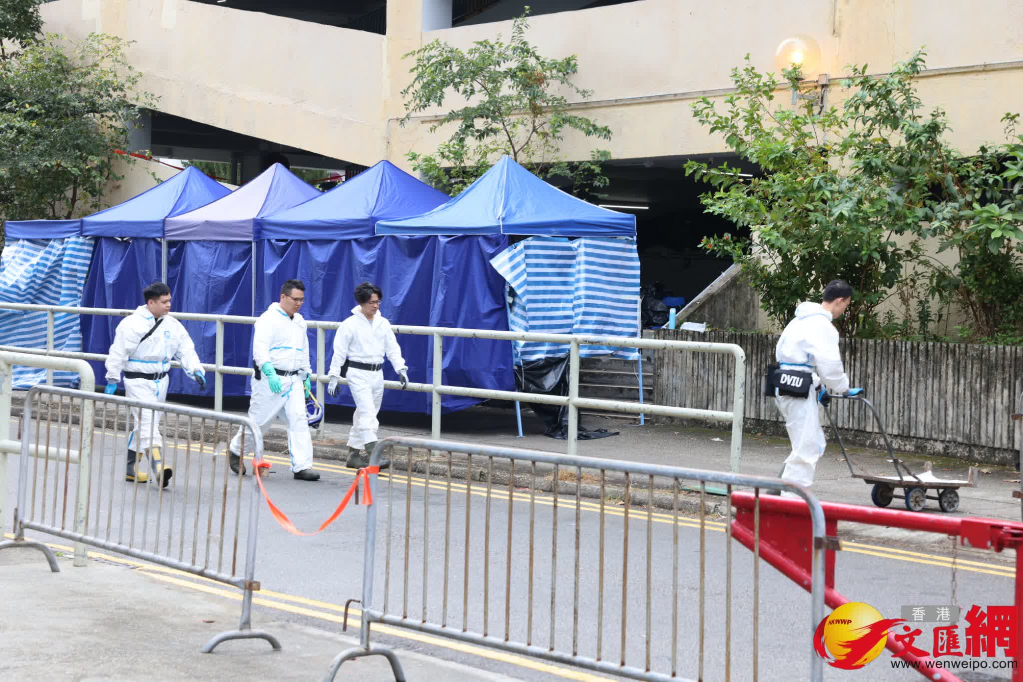 警方及消防處等部門人員今日繼續現場調查工作。香港文匯報記者劉友光攝