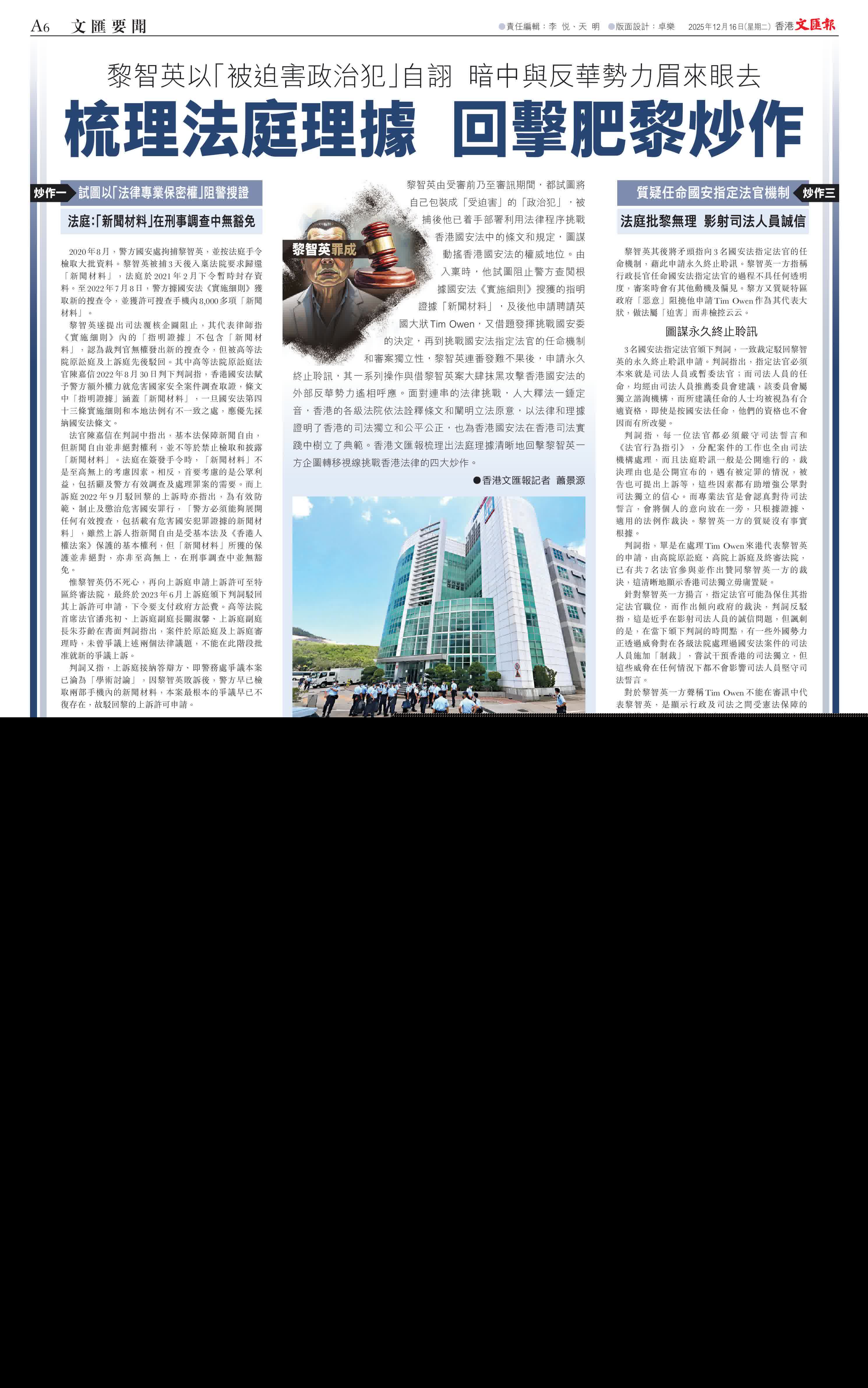 (香港文匯報記者 蕭景源)黎智英由受審前乃至審訊期間,都試圖將自己包裝成「受迫害」的「政治犯」,被捕後他已着手部署利用法律程序挑戰香港國安法中的條文和規定,圖謀動搖香港國安法的權威地位。由入稟時,他試圖阻止警方查閱根據國安法《實施細則》搜獲的指明證據「新聞材料」,及後他申請聘請英國大狀Tim Owen,又借題發揮挑戰國安委的決定,再到挑戰國安法指定法官的任命機制和審案獨立性,黎智英連番發難不果後,申請永久終止聆訊,其一系列操作與借黎智英案大肆抹黑攻擊香港國安法的外部反華勢力遙相呼應。面對連串的法律挑戰,人大釋法一錘定音,香港的各級法院依法詮釋條文和闡明立法原意,以法律和理據證明了香港的司法獨立和公平公正,也為香港國安法在香港司法實踐中樹立了典範。香港文匯報梳理出法庭理據清晰地回擊黎智英一方企圖轉移視線挑戰香港法律的四大炒作。
