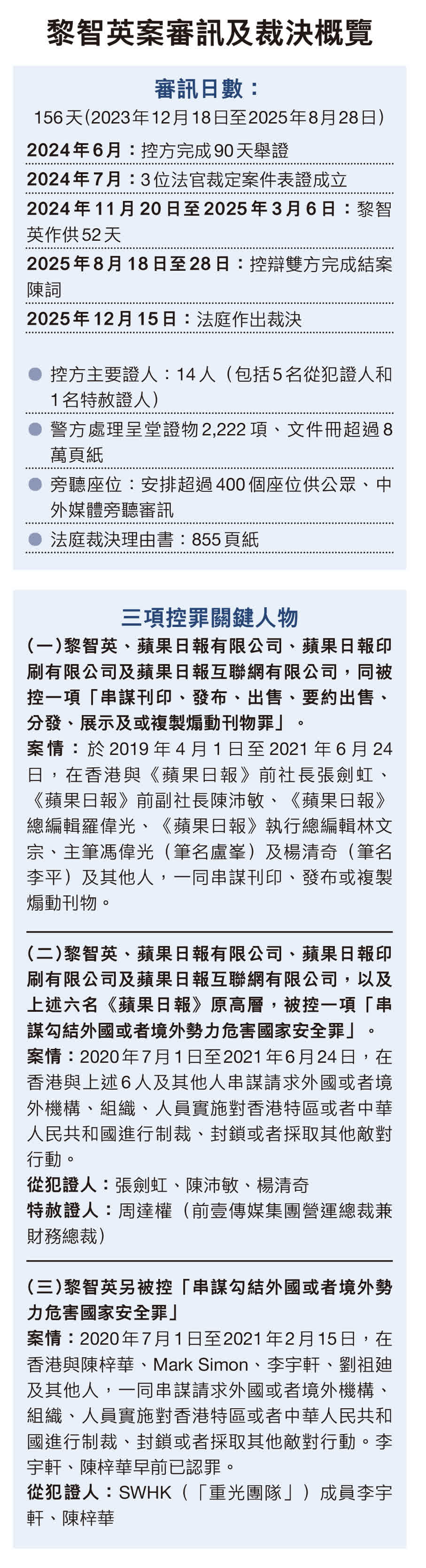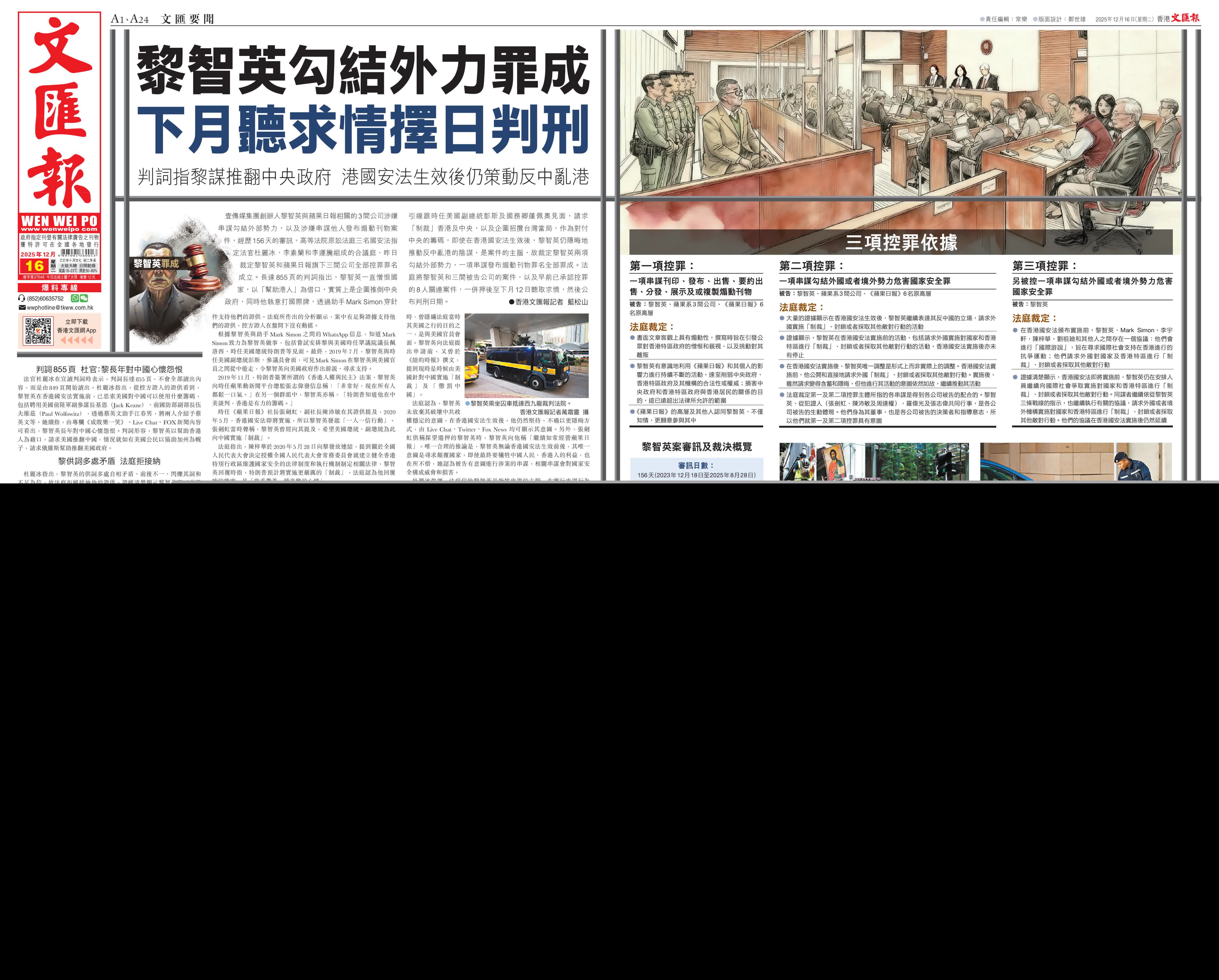 (香港文匯報記者 藍松山)壹傳媒集團創辦人黎智英與蘋果日報相關的3間公司涉嫌串謀勾結外部勢力,以及涉嫌串謀他人發布煽動刊物案件,經歷156天的審訊,高等法院原訟法庭三名國安法指定法官杜麗冰、李素蘭和李運騰組成的合議庭,昨日裁定黎智英和蘋果日報旗下三間公司全部控罪罪名成立。長達855頁的判詞指出,黎智英一直憎恨國家,以「幫助港人」為借口,實質上是企圖推倒中央政府,同時他執意打國際牌,透過助手Mark Simon穿針引線跟時任美國副總統彭斯及國務卿蓬佩奧見面,請求「制裁」香港及中央,以及企圖招攬台灣當局,作為對付中央的籌碼,即使在香港國安法生效後,黎智英仍隱晦地推動反中亂港的陰謀,是案件的主腦,故裁定黎智英兩項勾結外部勢力,一項串謀發布煽動刊物罪名全部罪成。法庭將黎智英和三間被告公司的案件,以及早前已承認控罪的8人關連案件,一併押後至下月12日聽取求情,然後公布判刑日期。