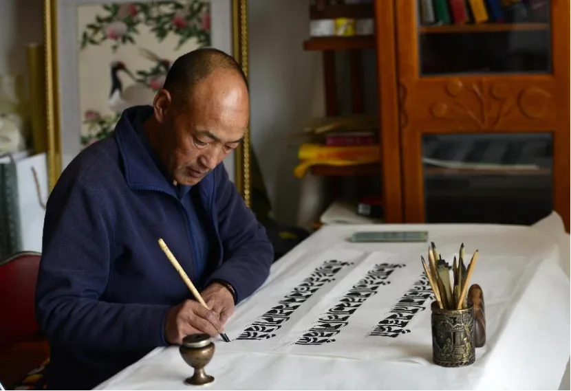 西藏贝叶经修复师在练习梵文书法。(资料图)中新社记者 周文元 摄