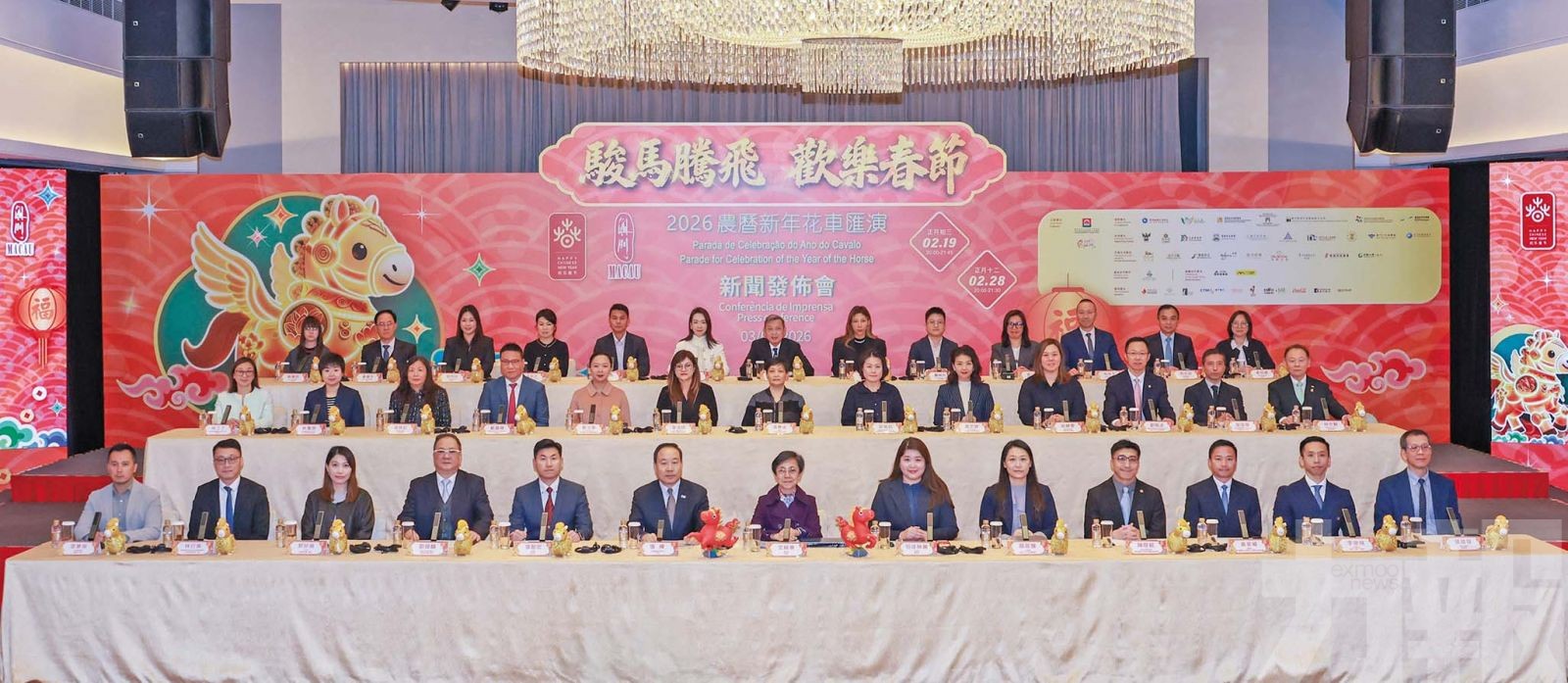 旅遊局昨(3)日舉行新聞發佈會,介紹「歡樂春節─2026年龍騰舞躍賀新春」社區巡演、「駿馬騰飛 歡樂春節 2026農曆新年花車匯演」及「金駿雲翔 歡樂春節」2026無人機煙花匯演三項活動內容。當中,備受矚目的「駿馬騰飛 歡樂春節 2026農曆新年花車匯演」將於2月19日至3月8日熱鬧登場。此系列活動涵蓋花車匯演、文藝表演、花車展覽及線上遊戲等多元環節,而重頭戲的花車匯演將分別於年初三(2月19 日)在西灣湖一帶、正月十二(2月28日)在北區精彩亮相,促進社區旅遊及夜間經濟。